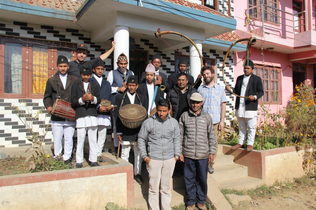 Ganesh Bahadur Pariyar and his Damai Panche Baja group, along with ATWR team David Bettencourt and Andrew Murphy, Our friend Kedar Gandhari is also pictured here, and thanks to him we were able to meet this band.